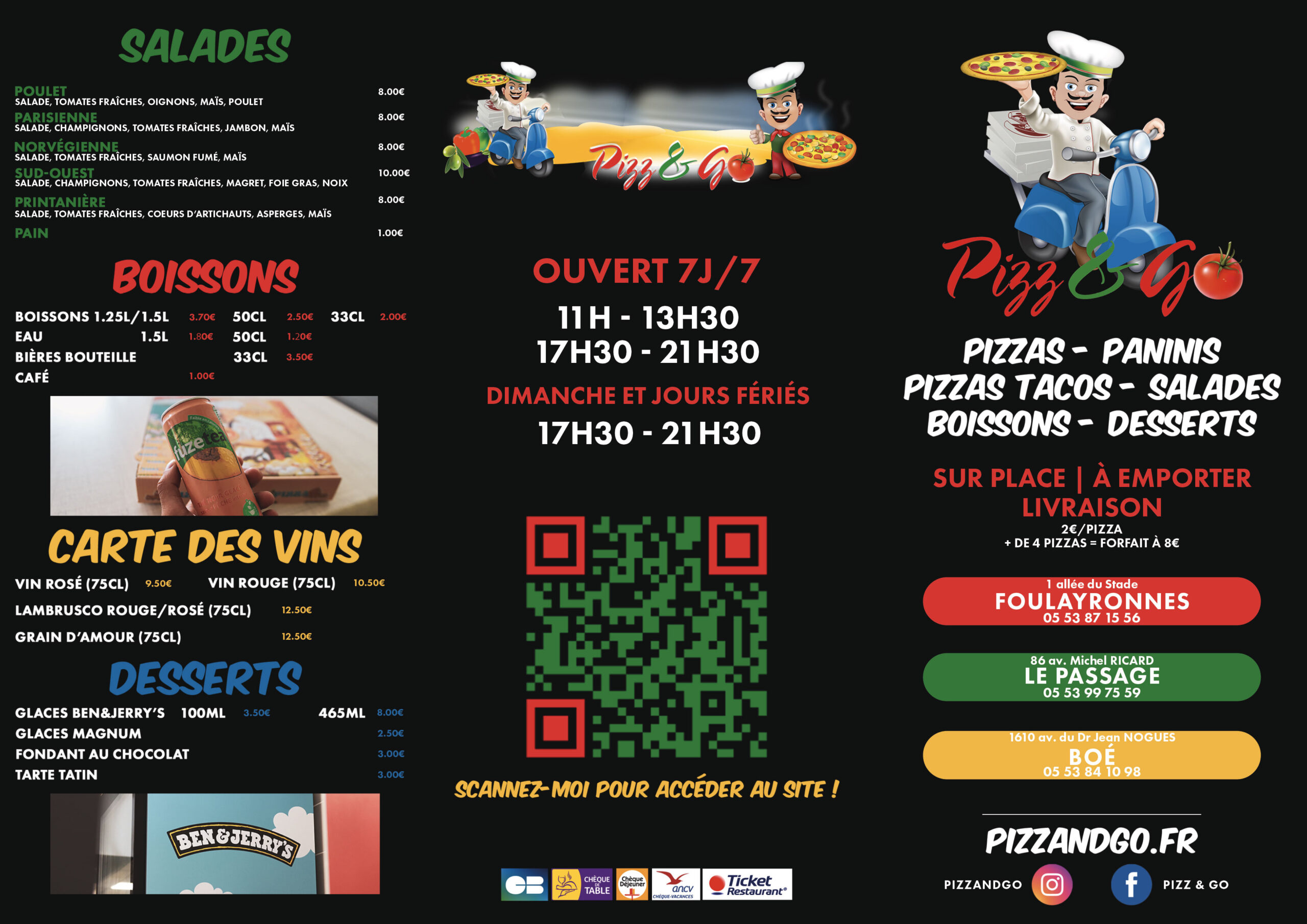 La pizzeria Pizz and Go vous accueille chaleureusement du lundi au samedi de 11h à 13h30 et de 17h30 à 21h30. Nous sommes également ouverts le dimanche et les jours fériés de 17h30 à 21h30. Profitez de nos trois points de vente situés à Foulayronnes, Boé et Le Passage pour savourer nos délicieuses pizzas artisanales. Chaque pizza est préparée avec soin, pétrie sur place quotidiennement par nos équipes pour garantir fraîcheur et authenticité. »